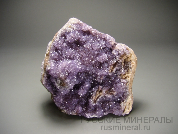 Щетка кристаллов аметиста, образовавшихся по трещине в окварцованном буром песчанике. Кристаллы размером до 2 мм, яркого сиреневого цвета, с прекрасным стеклянным блеском множества граней, создают бугорчатую живописную поверхность.