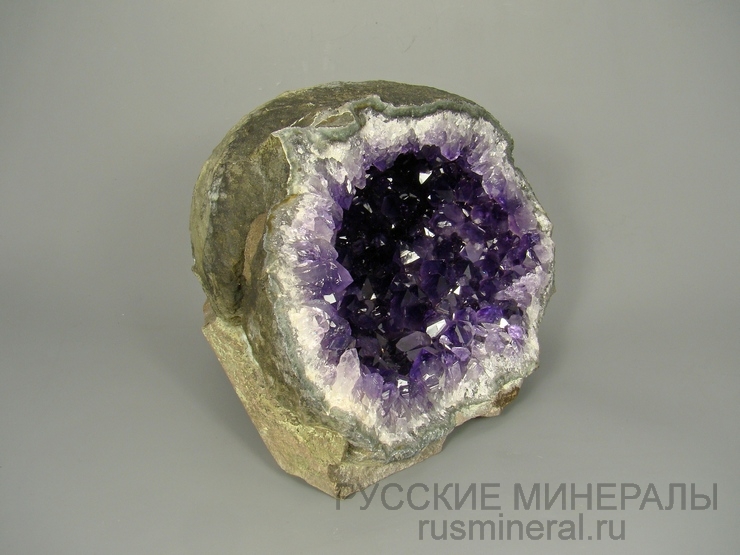 Фрагмент небольшой жеоды, сформировавшейся в толще застывших базальтовых лав. Жеода имеет форму каравая и выполнена светло-серым халцедоном и великолепно образованными, неравномерно окрашенными кристаллами кварца-бесцветными у основания и прозрачными, ярко-фиолетовыми ближе к вершинам. Размер кристаллов до 1 см.