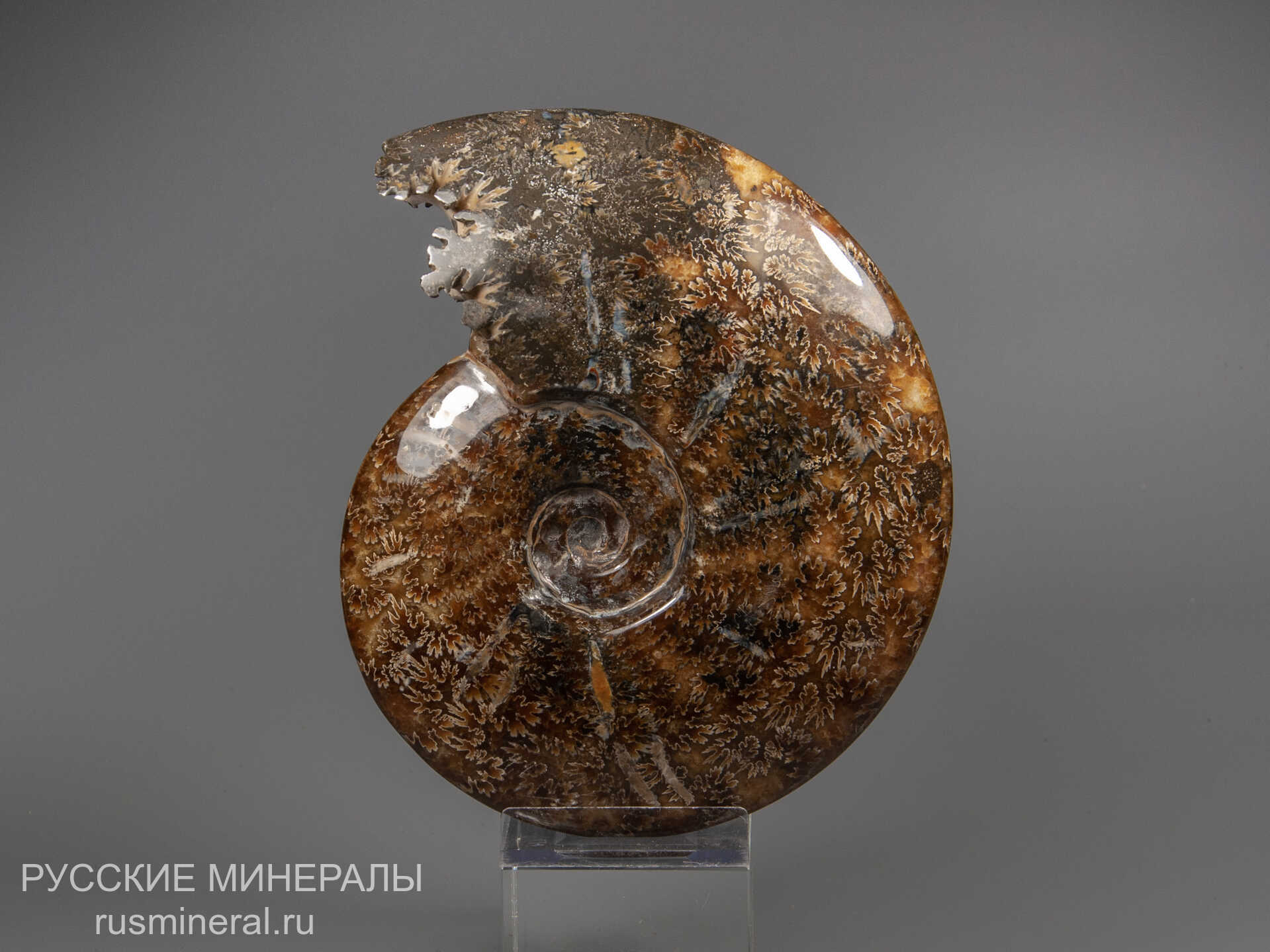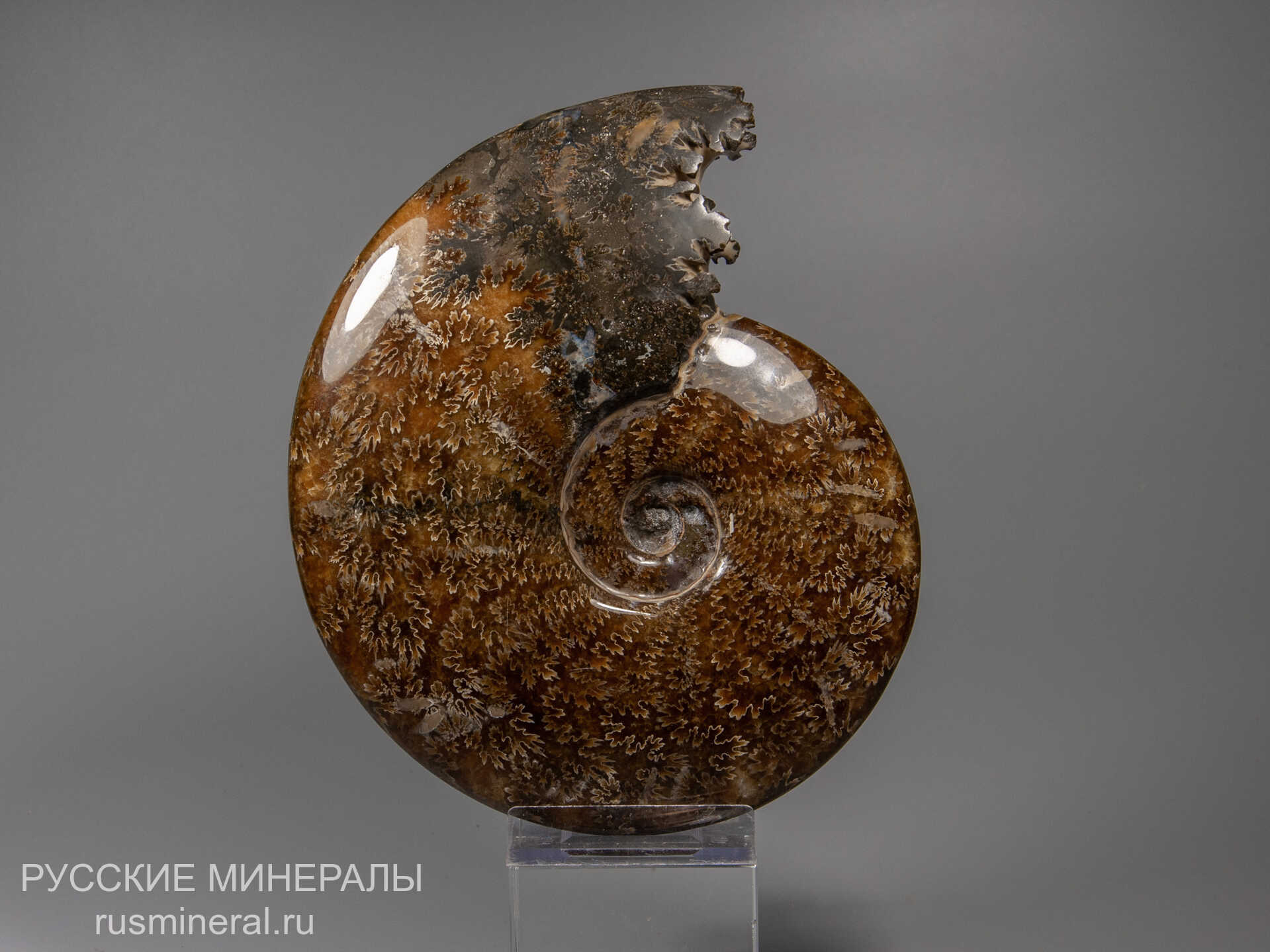 Полированная раковина аммонита (предположительно, рода Cleoniceras), выполненная желтым, оранжевым и коричневым кальцитом.