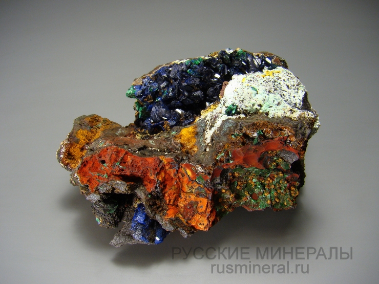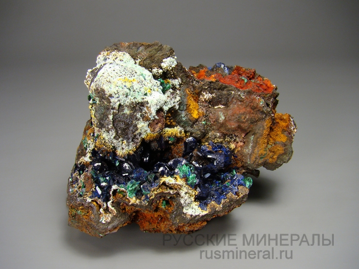 Кристаллы азурита, частично или полностью замещенного малахитом, и тонкие сферолитовые корочки голубого гиббсита на стенках полостей и трещин в контрастно окрашенной желто-красно-бурой железистой породе. На фоне светлого гиббсита хорошо различимы мелкие "шарики" черного и темно-коричневого делафоссита.