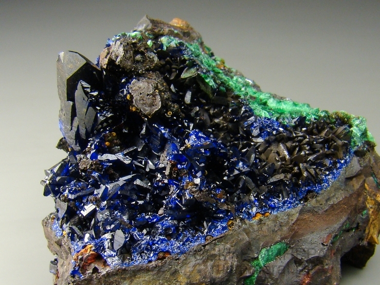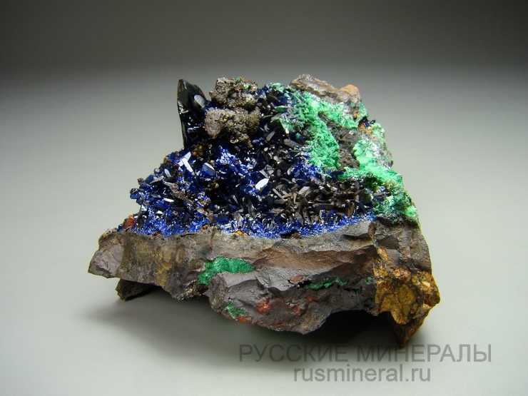 Кристаллы темно-синего азурита в ассоциации с почковидными натечными агрегатами бурого гётита на стенке полости в железистой породе. Тонкоигольчатый ярко-зеленый малахит образует полные и частичные псевдоморфозы по азуриту. Если вооружиться лупой, можно обнаружить мелкие (меньше 1 мм) сферолиты в различной степени измененного (замещенного гётитом) делафоссита, местами наросшего на грани азуритовых кристаллов и поверхность гётитовых псевдосталактитов. Из редких минералов в образце (с большой степенью вероятности!) присутствует креднерит (CuMnO2) в виде черной порошковатой корки, окруженной малахитом (на фото № 1 в правом верхнем углу образца). Кстати, Каменушинское месторождение – место первой находки креднерита на территории России.