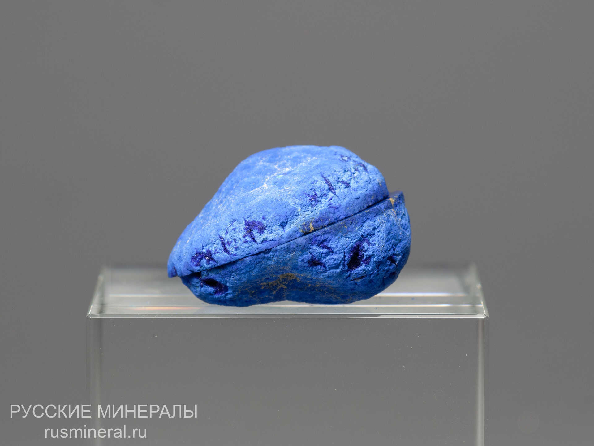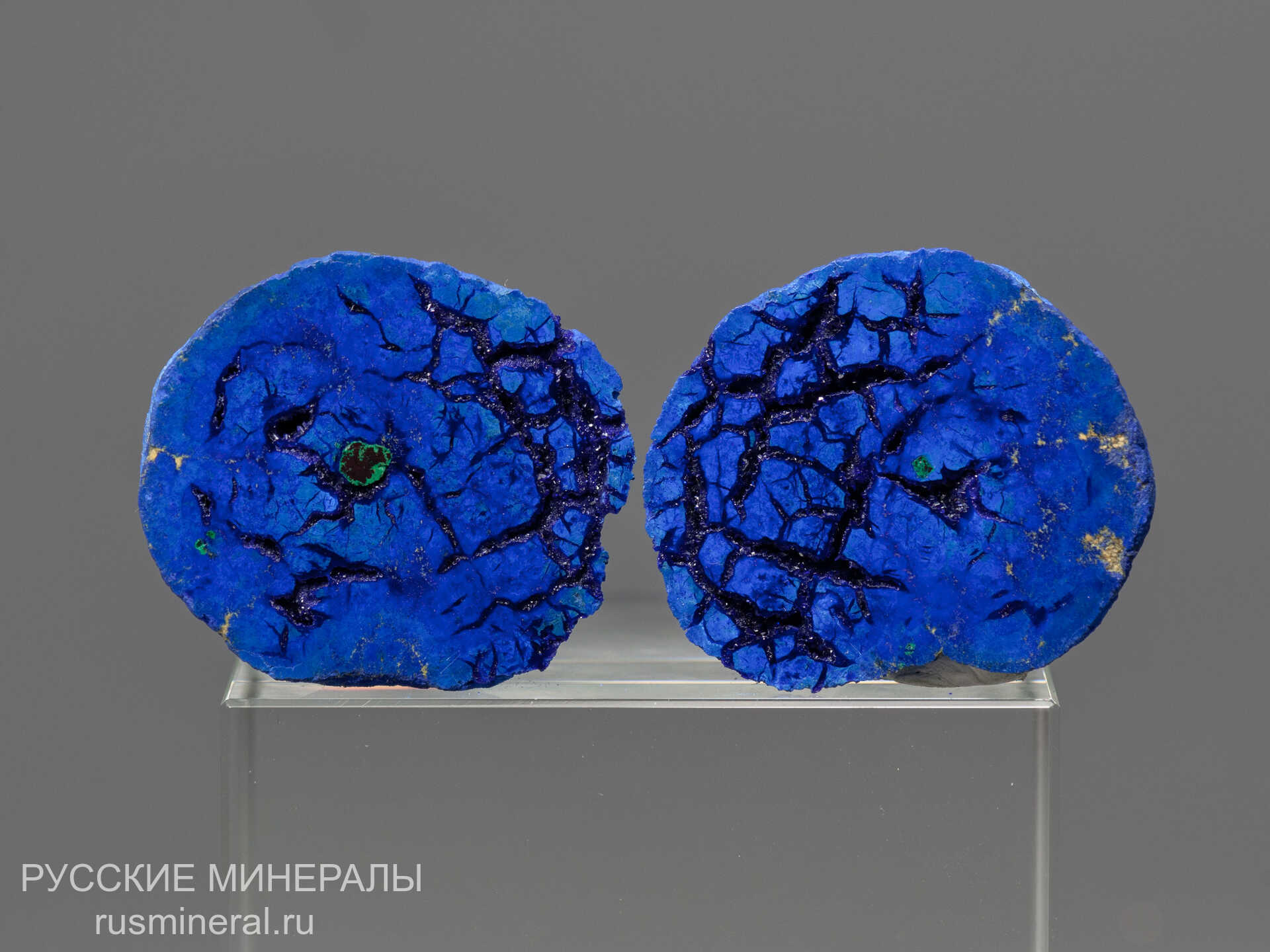 Распиленная и отполированная конкереция азурита с немногочисленными включениями куприта (частично замещенного малахитом) из зоны окисления месторождения. Стенки трещин усыхания внутри конкереции покрыты мелкими кристалликами темно-синего азурита второй генерации.