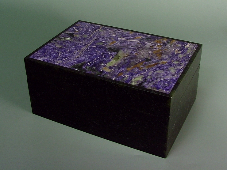 Шкатулка из змеевика, на крышке вставка из чароита. Внутри отделана деревом.