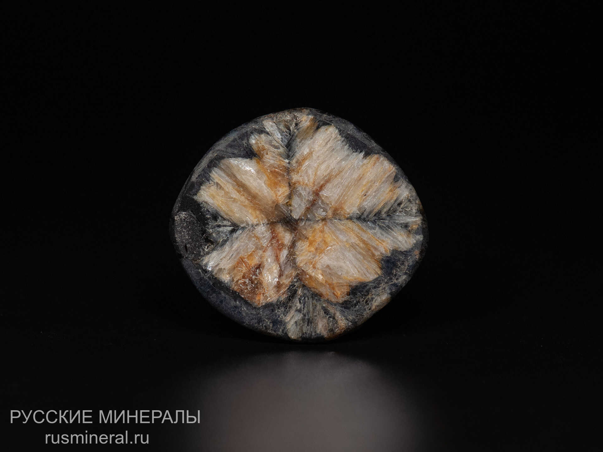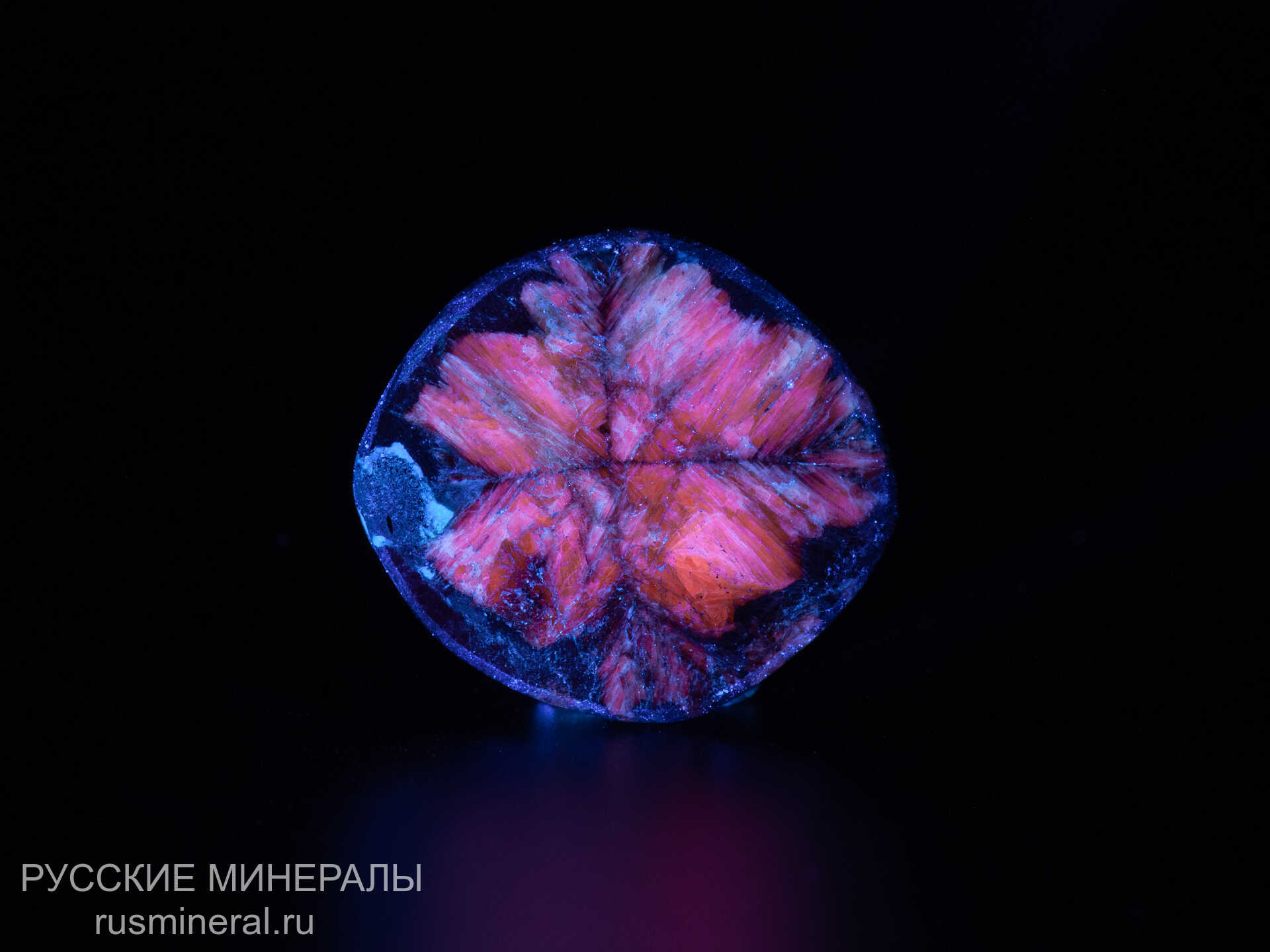 Параморфоза кианита по кристаллу андалузита (хиастолита). Обладает яркой оранжевой флуоресценцией в длинных волнах ультрафиолета (UVА).