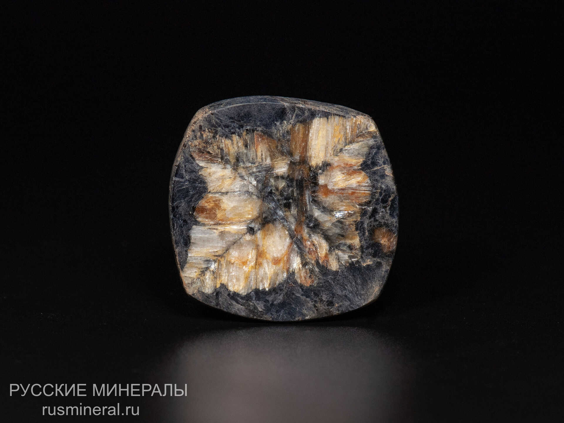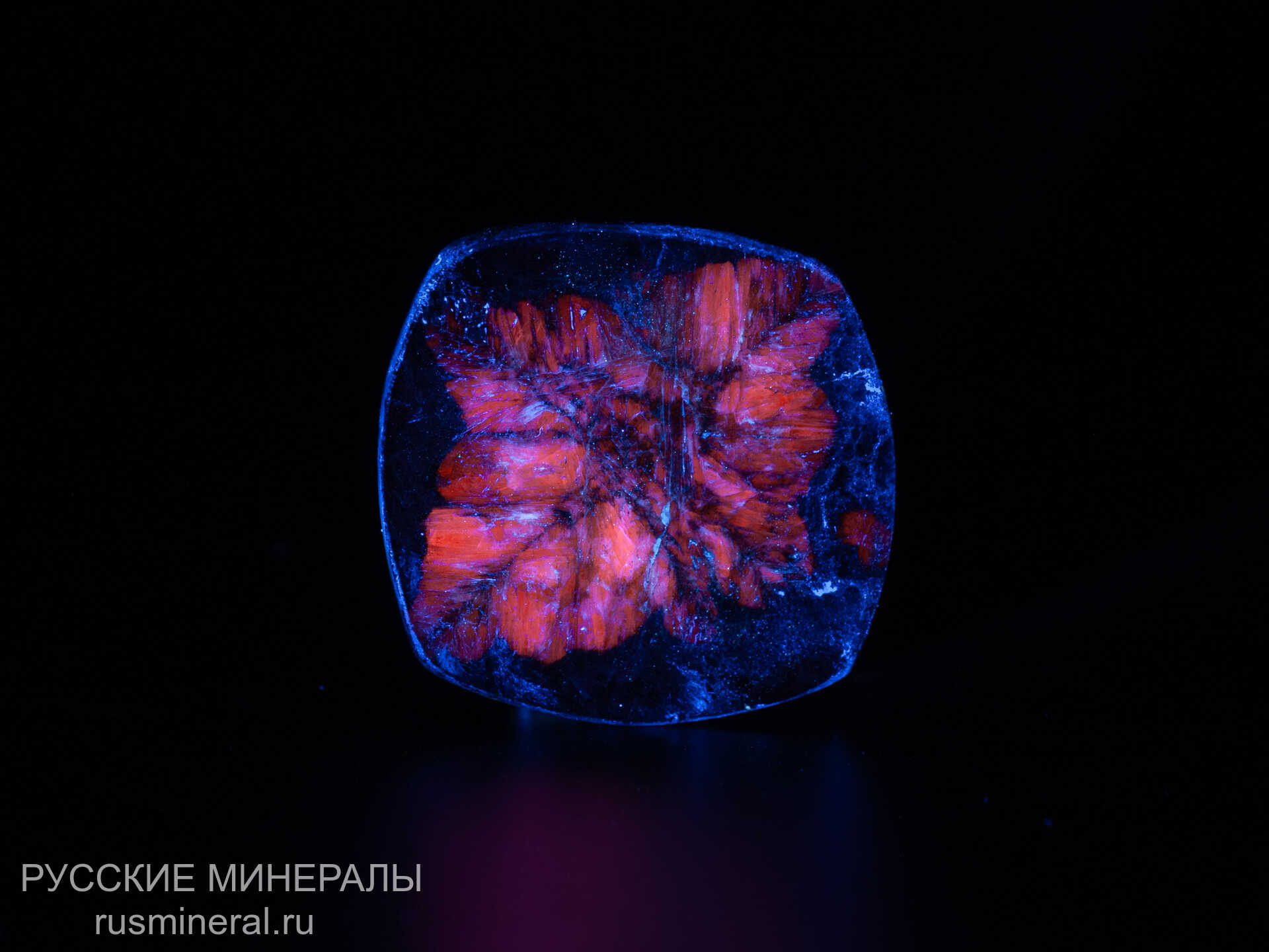 Параморфоза кианита по кристаллу андалузита (хиастолита). Обладает яркой оранжевой флуоресценцией в длинных волнах ультрафиолета (UVА).