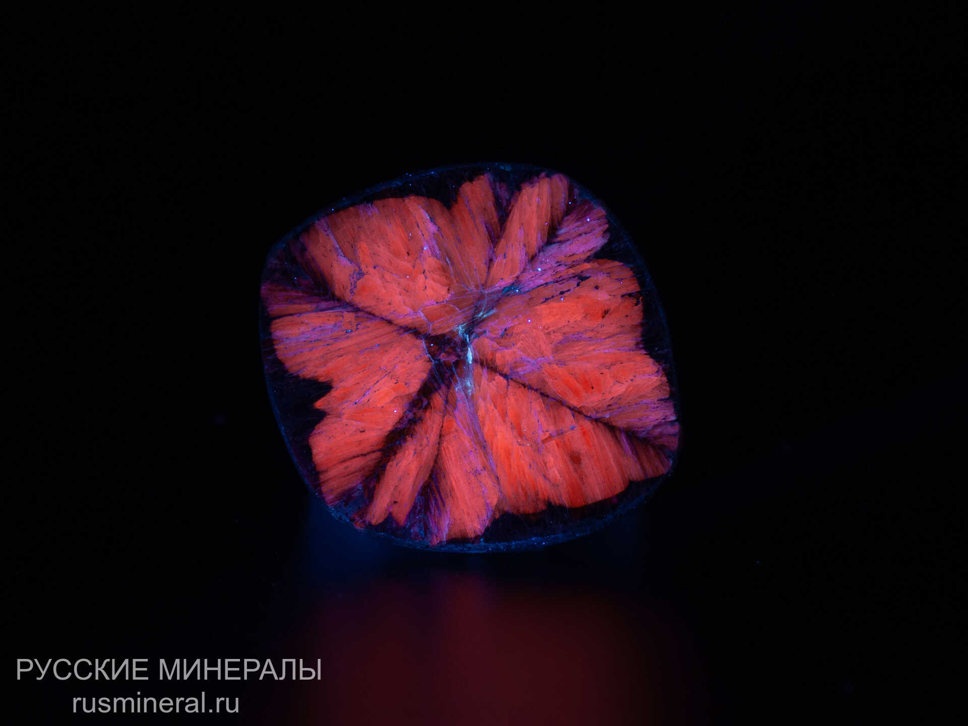 Параморфоза кианита по кристаллу андалузита (хиастолита). Обладает яркой оранжевой флуоресценцией в длинных волнах ультрафиолета (UVА).
